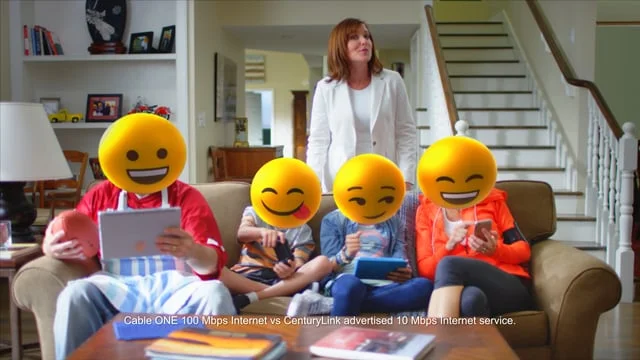 We suggest animated commercials centering on the emojis themselves working through the challenges solved by Cable One. These should be in either entirely 3D generated environments or with plates acquired for the task. These emojis can be standalone or with human bodies, depending on the scripts. We should use in-house personnel for the actors. We can employ Blue screens to help batch-capture characters and remain cost efficient.